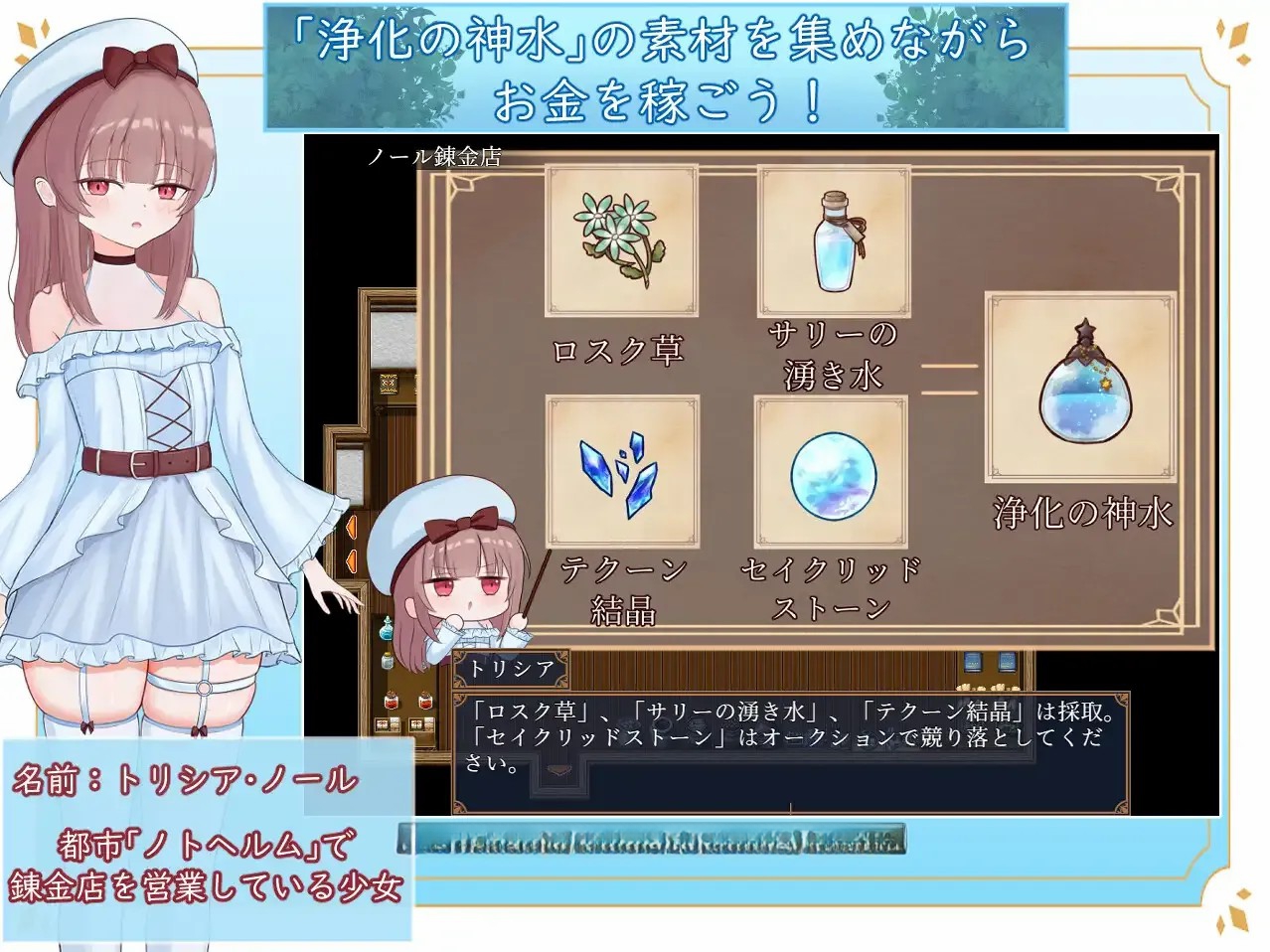 “净化神水”的材料既有通过采集获得的,也有仅在拍卖会上出售的!一边在各地收集采集材料,一边赚取用于在拍卖会上成功竞标所需的资金50万G吧!